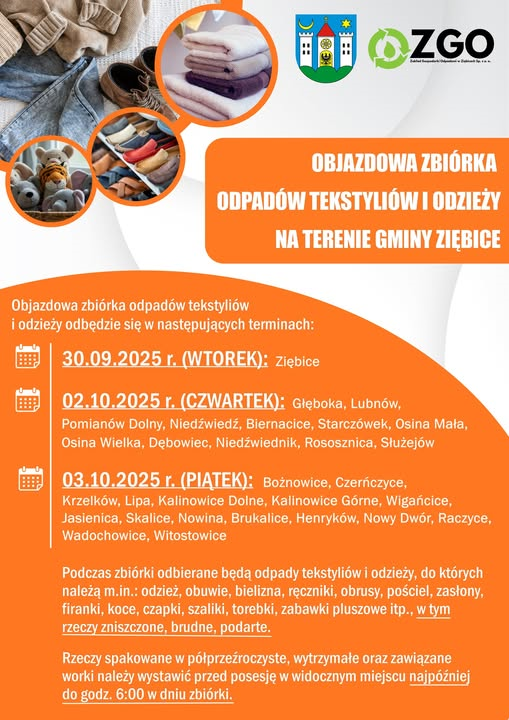 Na terenie gminy Ziębice odbędzie się objazdowa zbiórka odpadów tekstylnych i odzieży. Poniżej przedstawiamy harmonogram.