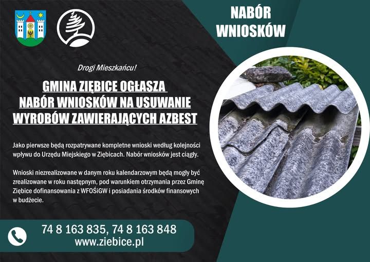 Gmina Ziębice rozpoczęła nabór wniosków na usuwanie wyrobów zawierających azbest. Decyduje kolejność zgłoszeń, nabór ma charakter ciągły.