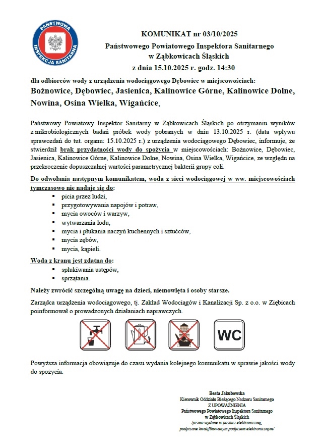 Są to: Bożnowice, Dębowiec, Jasienica, Kalinowice Górne, Kalinowice Dolne, Nowina, Osina Wielka oraz Wigańcice. Powodem jest przekroczenie dopuszczalnej wartości bakterii grupy coli.