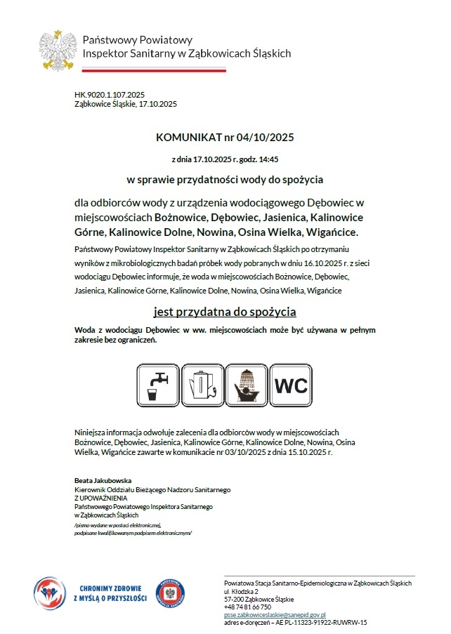Sanepid informuje: woda z urządzenia wodociągowego Dębowiec jest przydatna do spożycia i może być używana w pełnym zakresie bez ograniczeń. Poniżej komunikat.