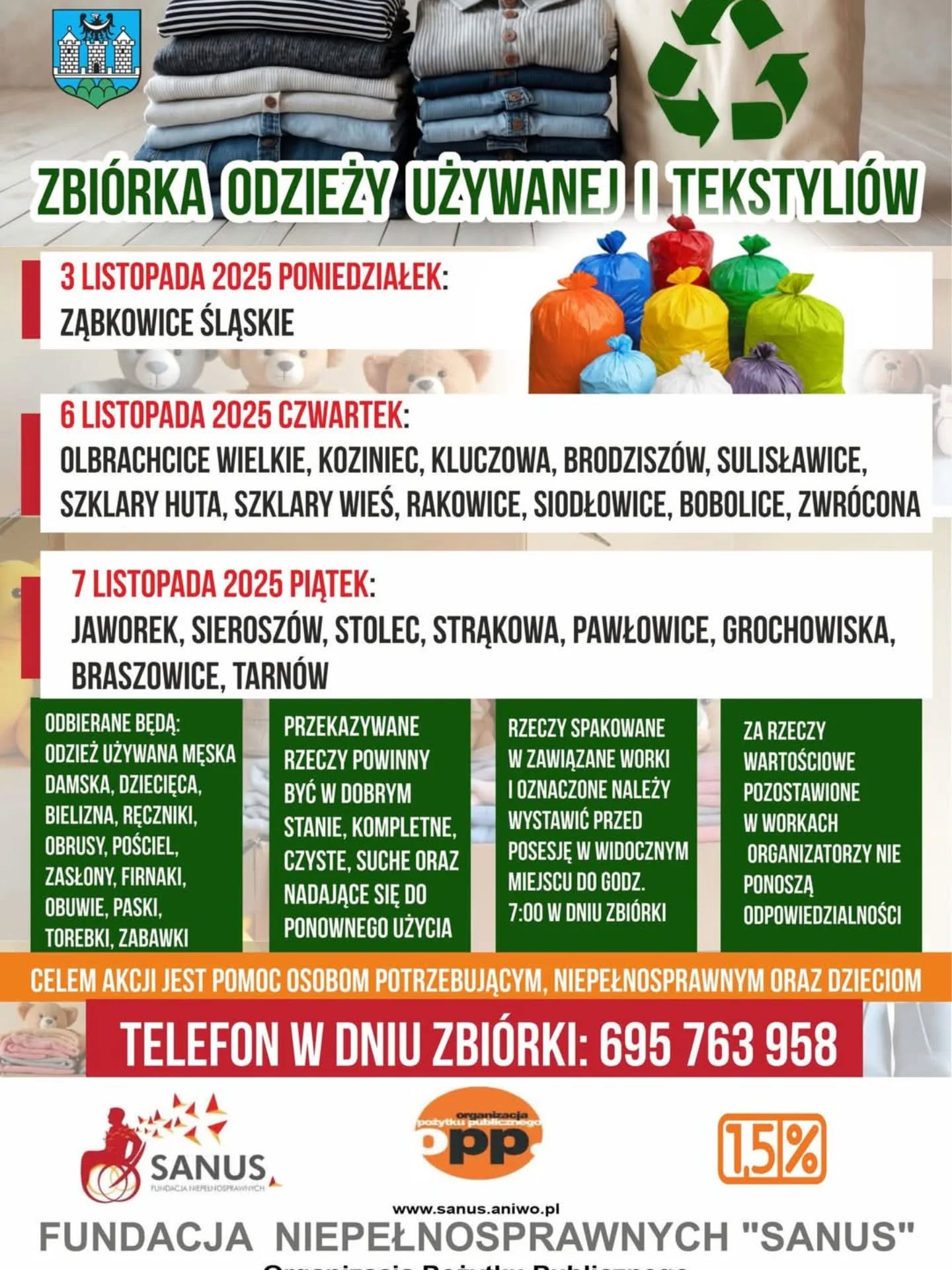 Fundacja Niepełnosprawnych „SANUS” zaprasza mieszkańców gminy Ząbkowice Śląskie do udziału w zbiórce odzieży używanej i tekstyliów.