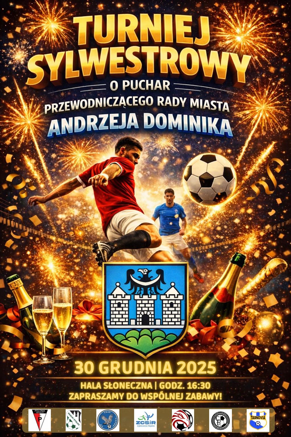 Turniej będzie okazją do sportowego zakończenia roku 2025. Na parkiecie rywalizować będą lokalne drużyny piłkarskie, a rozgrywkom towarzyszyć ma wyjątkowa, sylwestrowa atmosfera. Zagrają: Orzeł Ząbkowice Śląskie, Tarnovia Tarnów, Polonia Ząbkowice Śląskie, Skałki Stolec, Czarni Braszowice oraz STS Sokół Smolec.