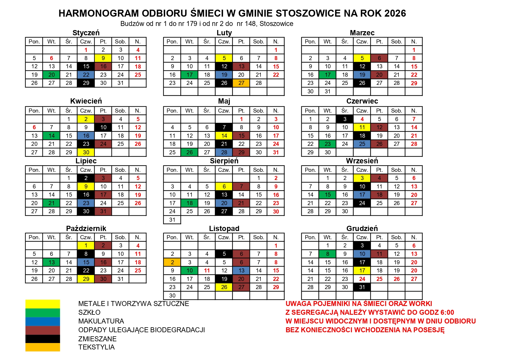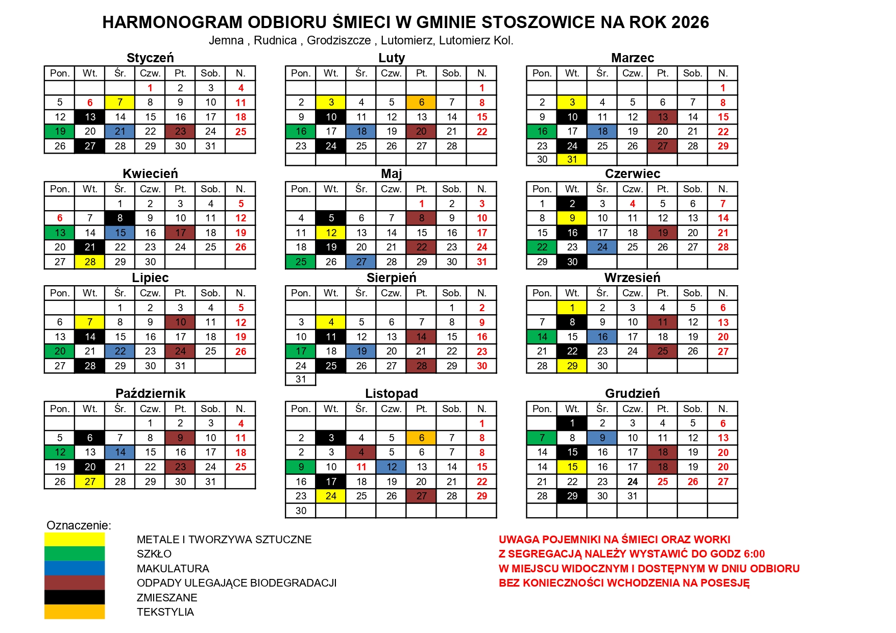 Gmina Stoszowice opublikowała harmonogram odbioru odpadów komunalnych na 2026 rok, który jest przeznaczony dla mieszkańców całej gminy.