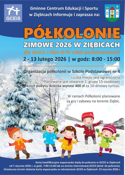 Gminne Centrum Edukacji i Sportu w Ziębicach organizuje zimowe półkolonie dla dzieci z klas 0–IV szkół podstawowych.