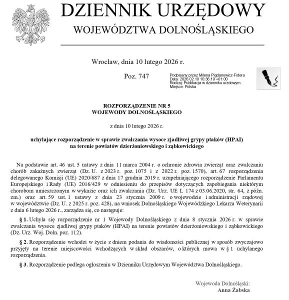 Wojewoda Dolnośląski uchylił rozporządzenie w sprawie zwalczania wysoce zjadliwej grypy ptaków (HPAI) na terenie dwóch powiatów.