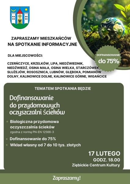 Gmina Ziębice zaprasza mieszkańców miejscowości: Czerńczyce, Krzelków, Lipa, Niedźwiednik, Niedźwiedź, Osina Mała, Osina Wielka, Starczówek, Służejów, Rososznica, Lubnów, Głęboka, Pomianów Dolny, Kalinowice Dolne, Kalinowice Górne oraz Wigańcice na spotkanie informacyjne dotyczące możliwości uzyskania dofinansowania do budowy przydomowych oczyszczalni ścieków.
