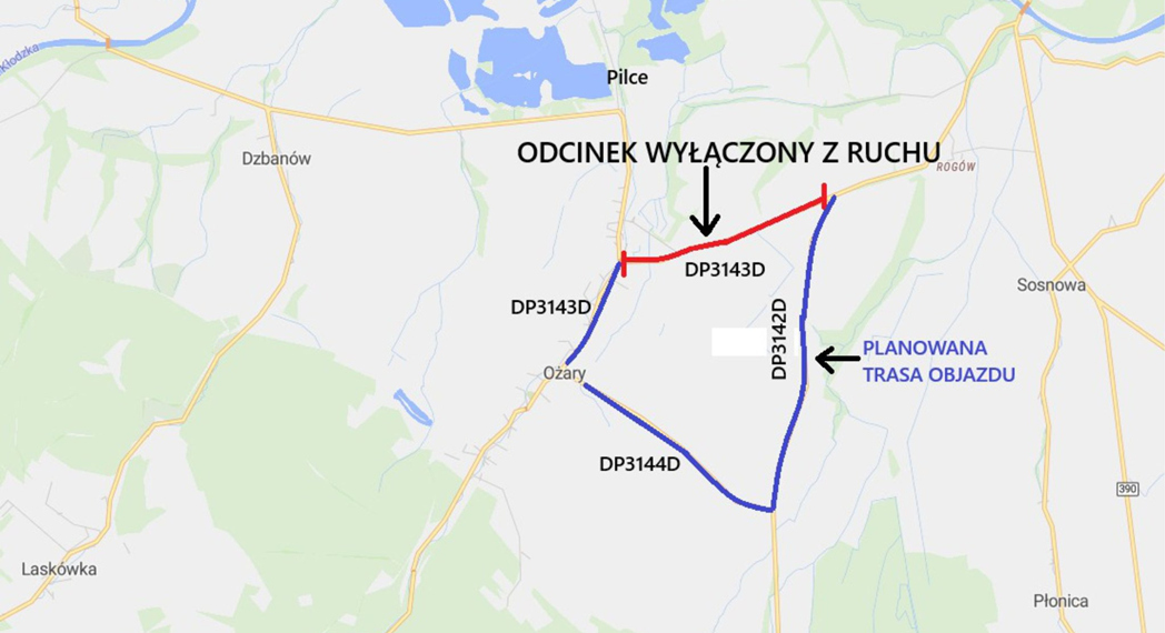 Wyłączony z ruchu zostanie fragment drogi od skrzyżowania z drogą w kierunku Mąkolna (jadąc od drogi wojewódzkiej nr 390 w kierunku Ożar) do skrzyżowania w miejscowości Ożary. Odcinek ten będzie całkowicie niedostępny dla ruchu pojazdów na czas prowadzenia robót budowlanych.