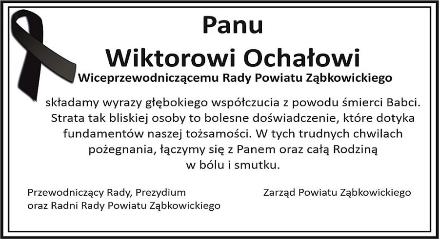 Kondolencje wiceprzewodniczącemu Rady Powiatu Ząbkowickiego, składa zarząd Powiatu Ząbkowickiego, przewodniczący rady, prezydium oraz radni Powiatu Ząbkowickiego.