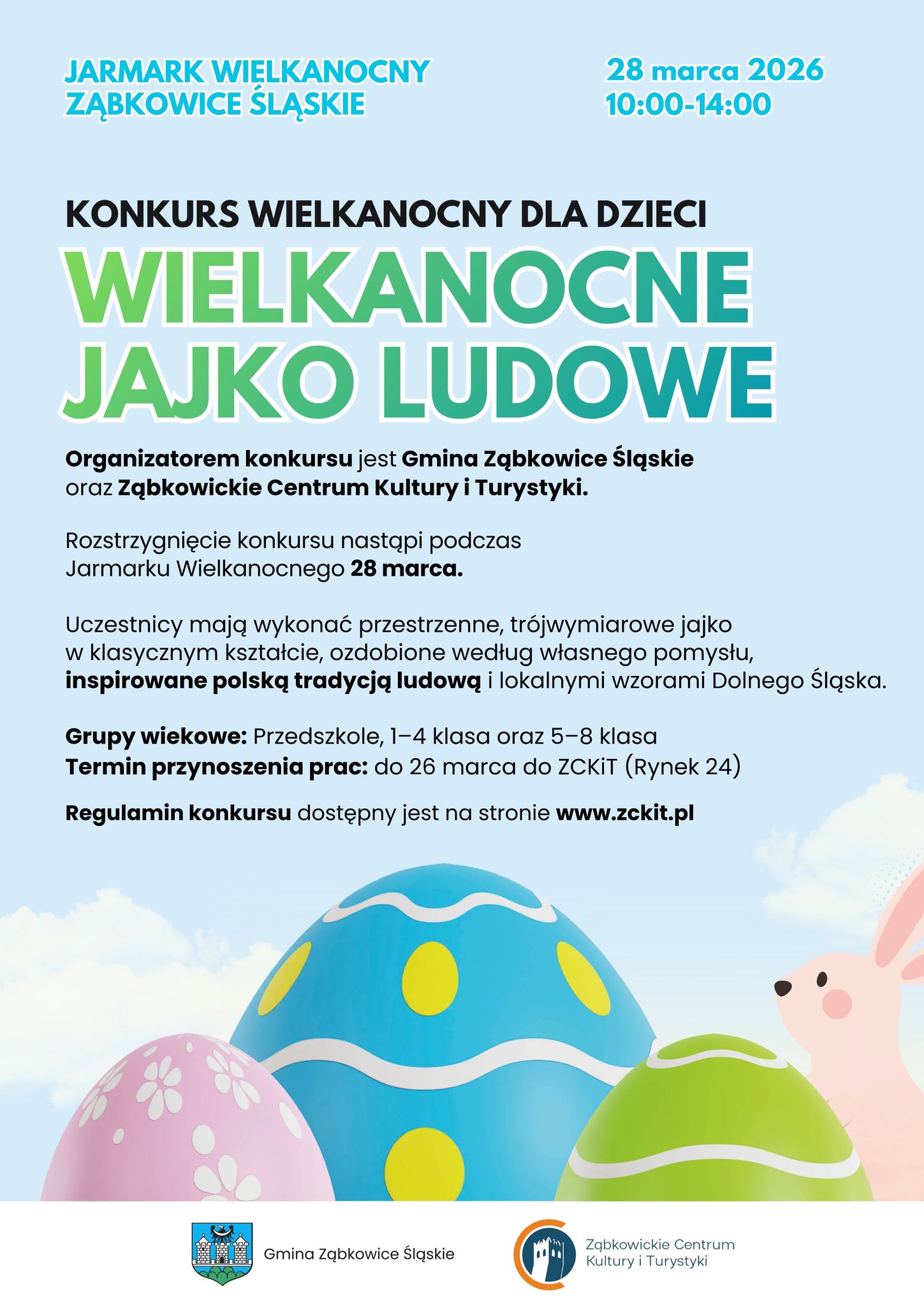 Zadaniem uczestników jest przygotowanie przestrzennego, trójwymiarowego jajka w klasycznym kształcie oraz ozdobienie go według własnego pomysłu. Inspiracją do stworzenia pracy powinny być polskie tradycje ludowe oraz charakterystyczne wzory Dolnego Śląska. Liczymy na kreatywność, pomysłowość i piękne nawiązania do wielkanocnej tradycji. Konkurs jest doskonałą okazją, aby rozwijać zdolności plastyczne, pobudzić wyobraźnię oraz zaprezentować swoją twórczość podczas świątecznego wydarzenia w naszym mieście.
