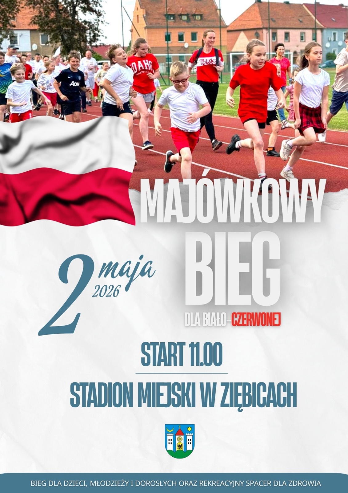 2 maja na Stadionie Miejskim w Ziębicach odbędzie się Majówkowy Bieg dla Biało-Czerwonej. Udział bez zapisów, dla wszystkich chętnych.