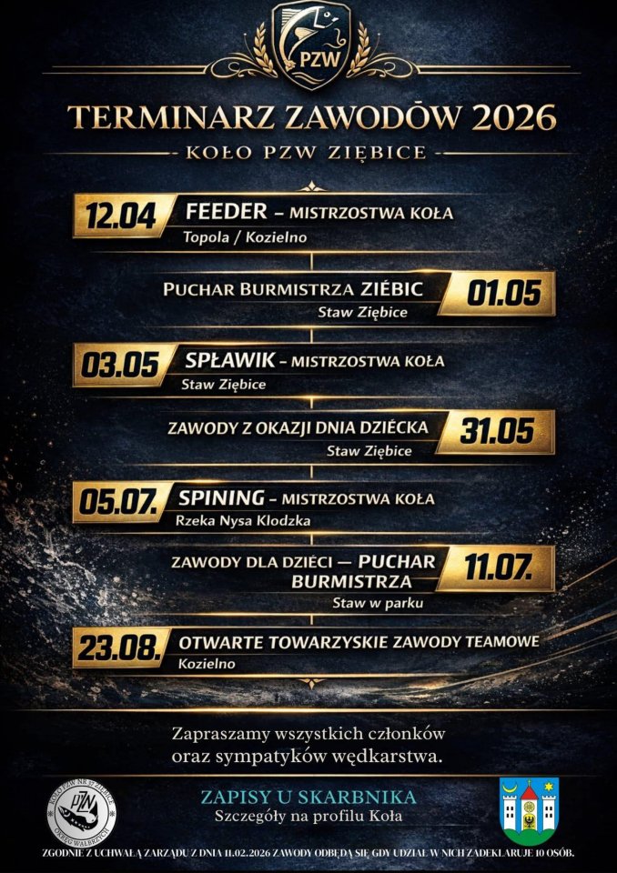 Koło PZW w Ziębicach opublikowało terminarz zawodów na 2026 rok. W planie m.in. zawody o Puchar Burmistrza oraz wydarzenia dla dzieci.