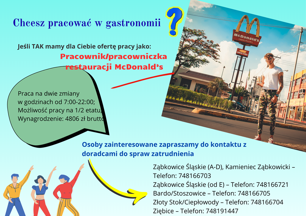 Powiatowy Urząd Pracy w Ząbkowicach Śląskich informuje o ofercie zatrudnienia w restauracji McDonald’s.