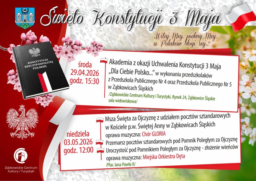 29 kwietnia o godz. 15.30 w sali widowiskowej Ząbkowickiego Centrum Kultury i Turystyki odbędzie się Akademia z okazji Uchwalenia Konstytucji 3 Maja w wykonaniu przedszkolaków z Przedszkola Publicznego Nr 4 oraz Przedszkola Publicznego Nr 5 w Ząbkowicach Śląskich.