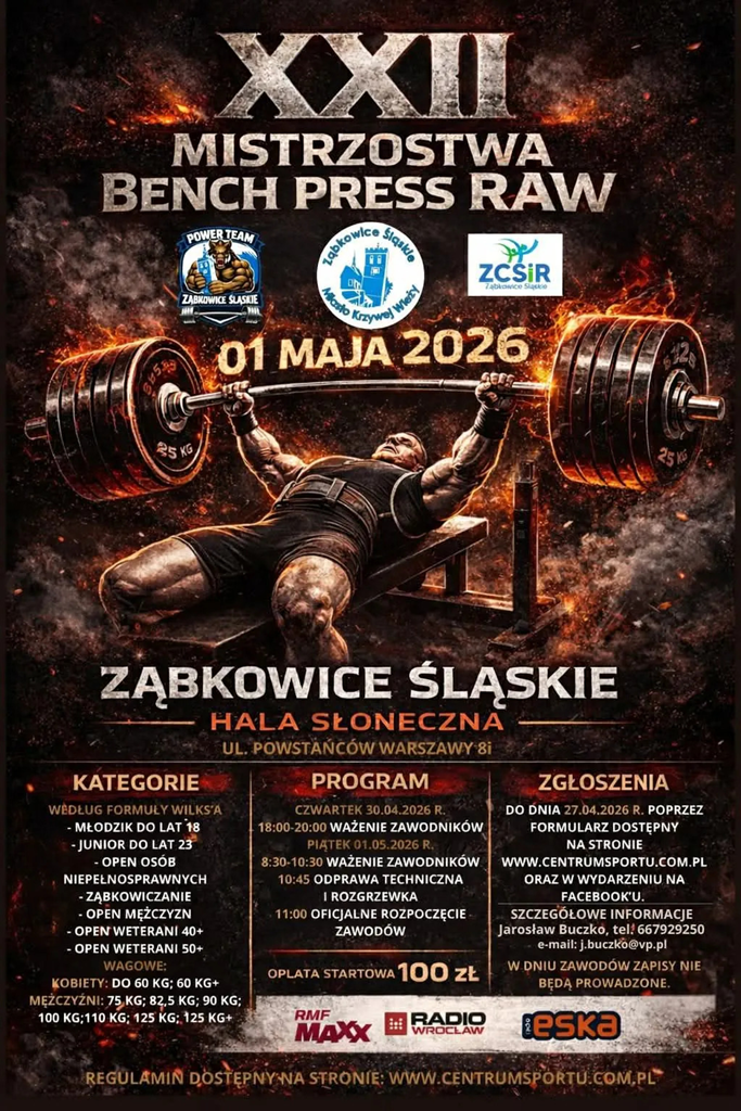 1 maja w hali Słonecznej odbędą się XXII Otwarte Mistrzostwa Ząbkowic Śląskich w Wyciskaniu Sztangi Leżąc RAW.