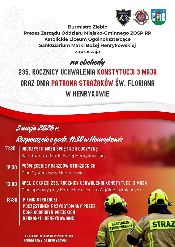 3 maja w Henrykowie odbędą się obchody rocznicy uchwalenia Konstytucji 3 Maja oraz Dnia Patrona Strażaków św. Floriana.