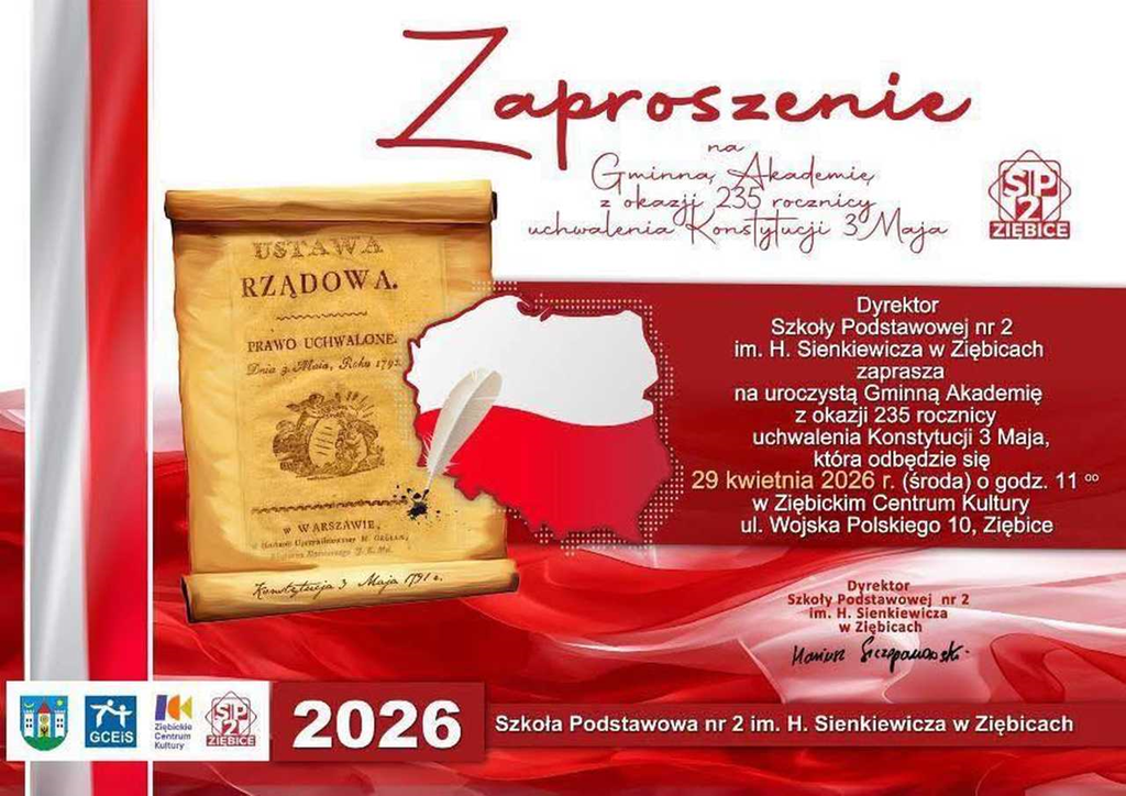 29 kwietnia o godz. 11 w Ziębickim Centrum Kultury odbyła się uroczysta Gminna Akademia upamiętniająca 235. rocznicę uchwalenia Konstytucji 3 Maja.