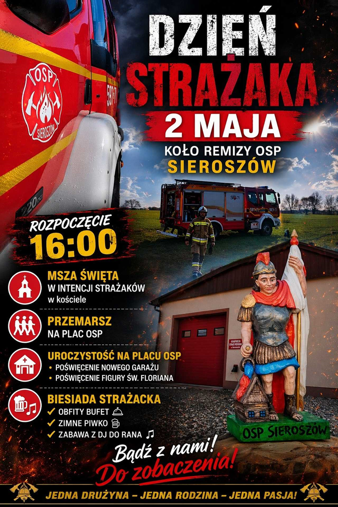 Uroczystości rozpoczną się o godz. 16. W programie przewidziano mszę w intencji strażaków, przemarsz oraz część oficjalną na placu przy remizie OSP, obejmującą m.in. poświęcenie nowego garażu i figury św. Floriana. Wydarzeniu towarzyszyć będzie strażacka biesiada z poczęstunkiem oraz oprawą muzyczną.