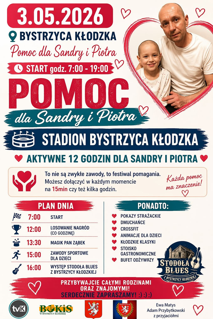 3 maja na stadionie przy ul. Orężnej w Bystrzycy Kłodzkiej odbędzie się wydarzenie charytatywne, którego celem jest wsparcie leczenia Sandry i Piotra.