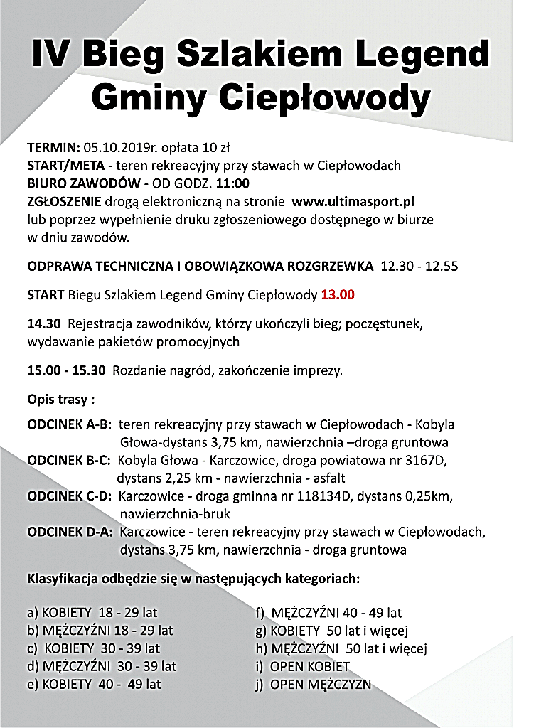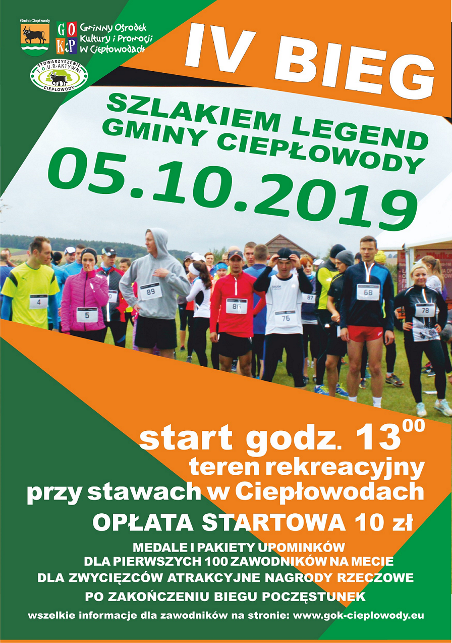 5 października odbędzie się IV Bieg Szlakiem Legend Gminy Ciepłowody. Bieg na dystansie 10 km rozpocznie się o godz 13 rozgrzewką na terenie rekreacyjnym przy stawach w Ciepłowodach.