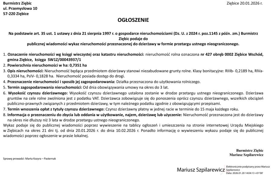 OGŁOSZENIODAWCA: Gmina ZiębiceCZAS TRWANIA: 2026-01-20 do 2026-02-10