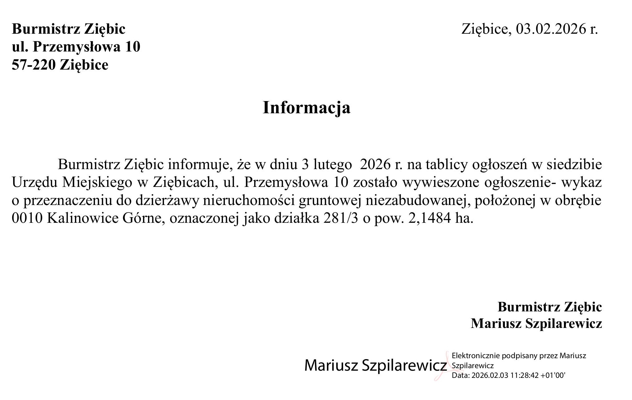 OGŁOSZENIODAWCA: Gmina ZiębiceCZAS TRWANIA: 2026-02-05 do 2026-02-17