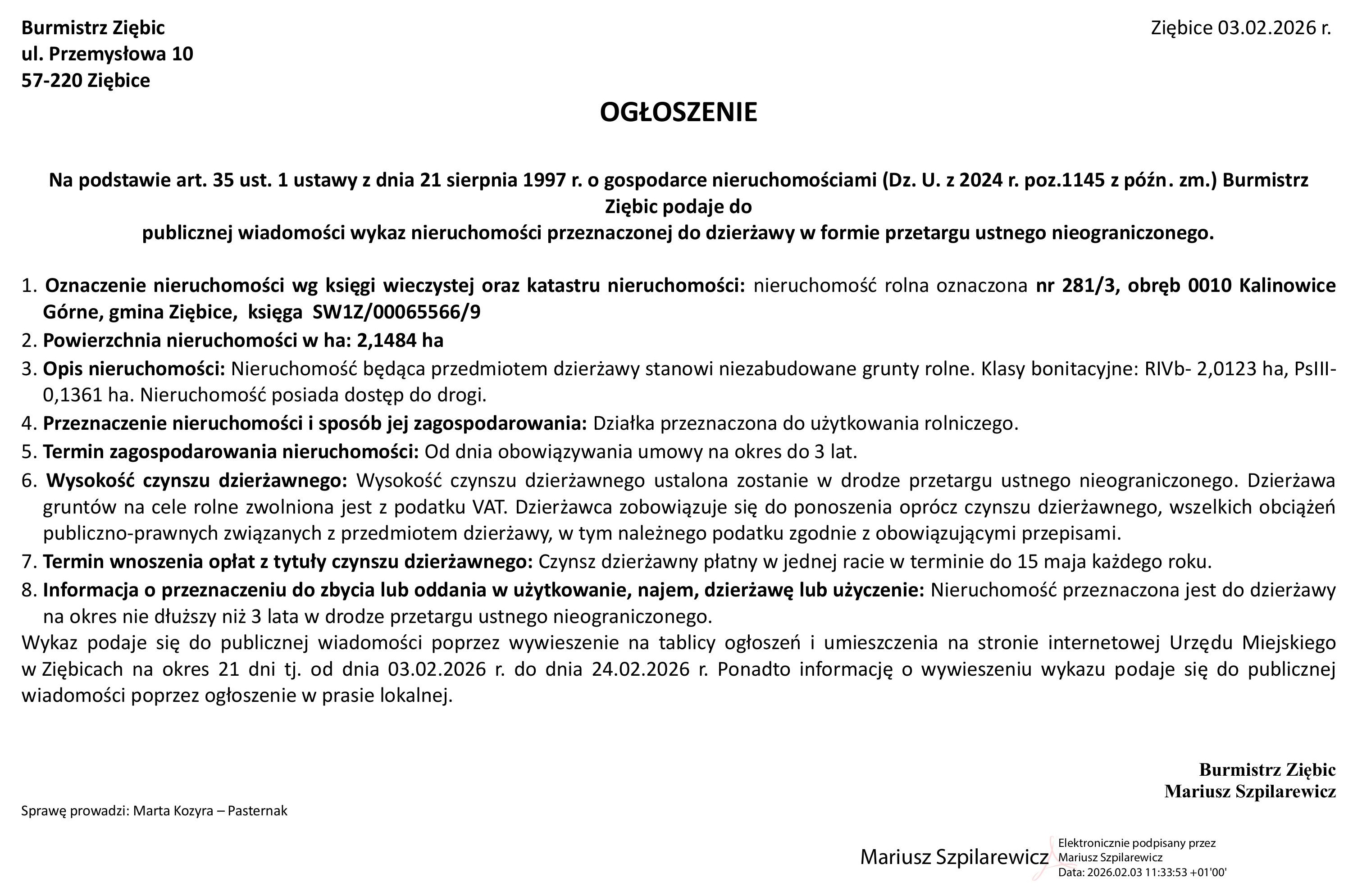 OGŁOSZENIODAWCA: Gmina ZiębiceCZAS TRWANIA: 2026-02-05 do 2026-02-17